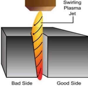 از آنجا که پلاسما جت به صورت مارپیچ (دورانی) خارج می گردد ، بسته به جهت حرکت و اولین سطح تماس خود با قطعه کار ، سطح قطعه کار را به صورت اریب برش می دهد . بسته به اینکه ساعت گرد یا پاد ساعت گرد حرکت کنیم ، سطح اریب می تواند تغییر کند . در شکل زیر به وضوح این موضوع به تصویر کشیده شده است .