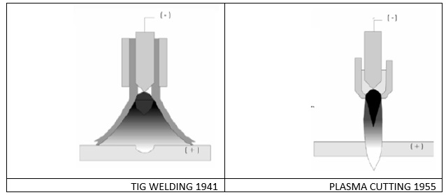 در سال 1941 میلادی جوشکاری TIG (جوشکاری قوسی با الکترود تنگستن و گاز بی اثر) توسعه پیدا کرد . در این فرآیند از یک الکترود غیر ذوبی از جنس تنگستن و گاز های محافظ بی اثری نظیر آرگون جهت محافظت از حوضچه مذاب استفاده می شود . در سال 1955 نخستین بار با ایجاد تغییراتی نسبت به فرآیند جوشکاری TIG برشکاری با قوس پلاسما اجرا شد