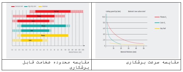 نمودار های فوق در انتخاب صحیح پروسه برش ، بسیار مهم و مفید هستند . با بررسی ضخامت و نوع فلزی که می خواهیم برشکاری کنیم می توانیم ابتدا فرایند (هایی) که امکان برشکاری با آنها وجود دارد را بررسی کرده و سپس سرعت (های) برشکاری را با یکدیگر مقایسه کنیم .